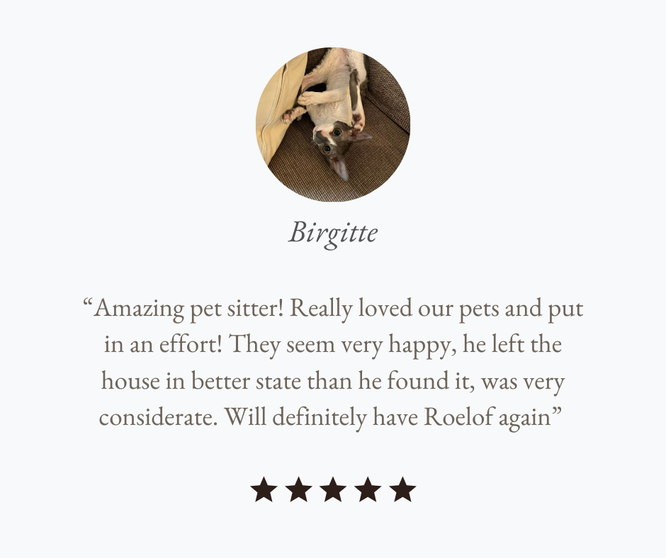 Enjoy true peace of mind while you’re away. With our reliable home and pet sitting services, your beloved pets stay happy and safe in their own environment receiving the same love, attention, and personalized care they’re used to. Your home stays secure, and your pets stay content. Don’t just take our word for it, browse through our client reviews and see why so many pet owners trust us time and time again.